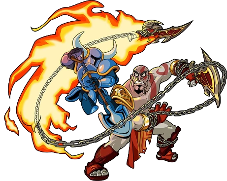 Kratos porta las Espadas del Caos dos pequeñas espadas que porta en su espalda con las cuales gira en círculos, arranca columnas y golpea a Shovel Knight contra la pared.