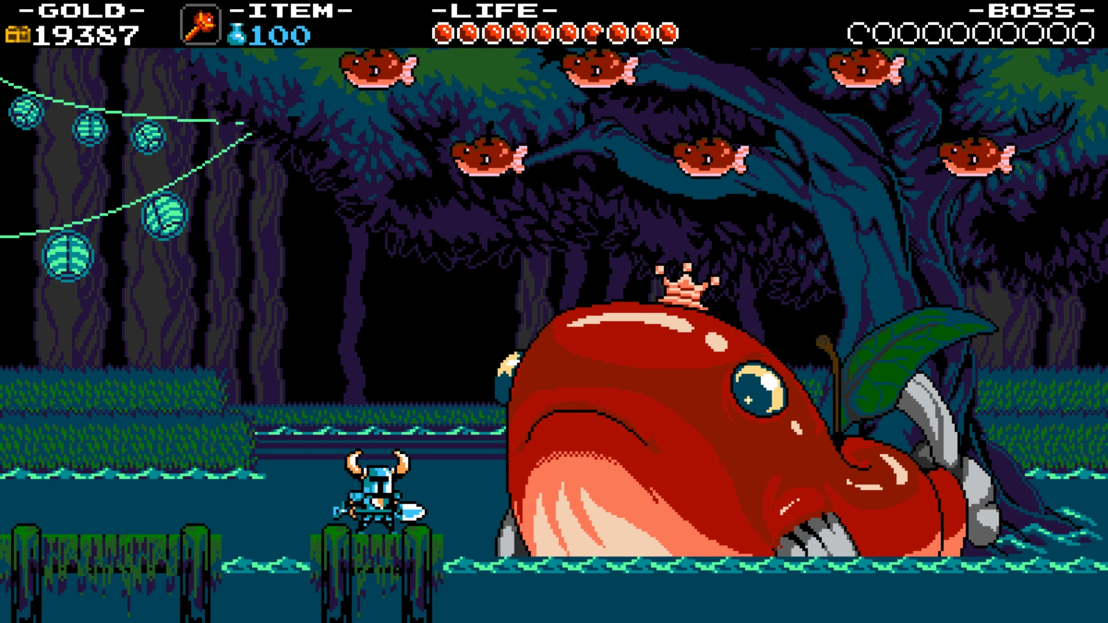 Если Лопатный рыцарь станет рыбачить в пруду используя удочку, то Король может сильно разозлится за вылов его поданных-рыблок. Тем не менее таким образом игрок сможет получить музыку «Вальс Короля рыблок» и кучу яблок вокруг восстанавливающих здоровье, хоть в этом и нет необходимости поскольку в данной локации Лопатный рыцарь не имеет возможности потерять его.