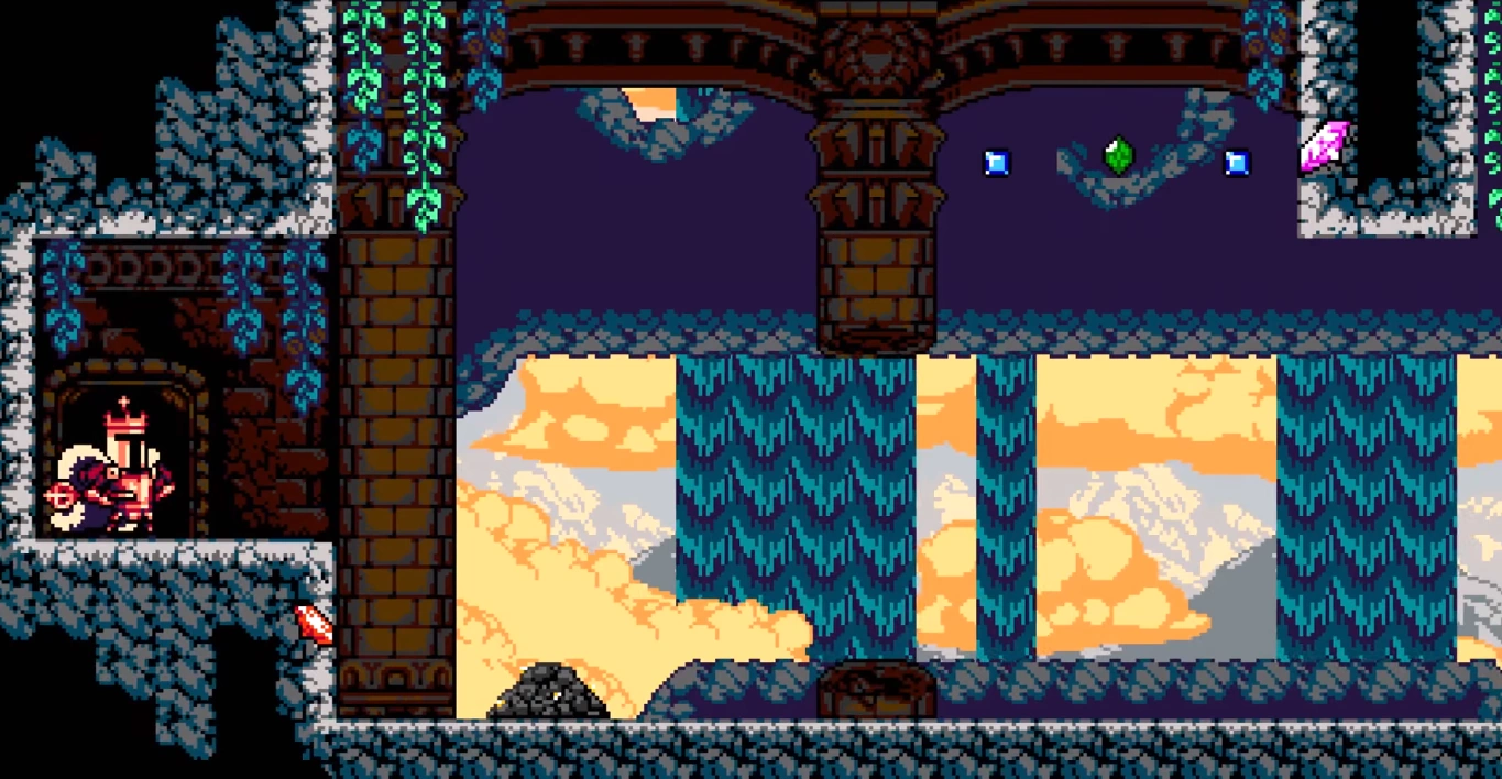 Birder Bluffs Loot is a loot stage (signified by a red gem on the map) that is unlocked after completing Gyro Foundry. The stage has the same tileset as Cyclone Sierra and King's Roost but with different enemies and challenges. Like the other loot stages the only rewards are treasure; this level exists solely to pad King Knight's wallet. The stage auto-scrolls, so King Knight must keep moving to the right. This is the only stage with Floatsmalls in it.