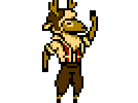 Doe, just like the Deer Ladies, is a bipedal anthropomorphic white-tailed deer. He wears a brown ushanka, a tan long-sleeved shirt with red suspenders, and brown trousers. Antlers stick out of his hat.