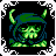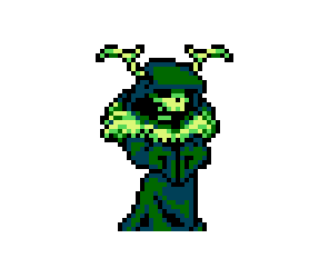 Gall is a green skeleton wearing a green robe with a neck fur and horns on his heads that resemble antlers.