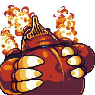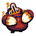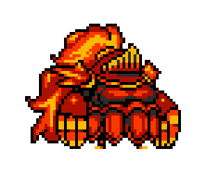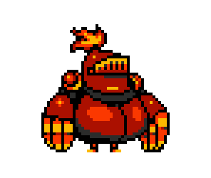 In most Shovel Knight games, Mole Knight wears red armor with big orange claws and fire emitters in his head and shoulders. His legs are short compared to his body.