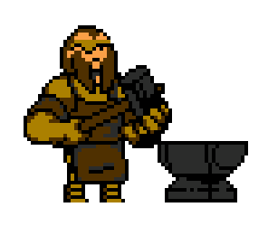 The Shovel Smith is a tall, brown haired and bearded man, and less gruff than his counterpart, the Armorer. He wears a yellow shirt, trousers, and gloves as well as a brown apron.