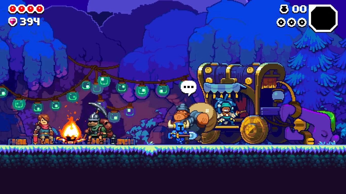 The Surface serves as a hub in Shovel Knight Dig. The Surface is a part of The Valley and it mainly consists of 3 parts. It's the main base of operations for Shovel Knight during his adventure; as such he always starts from here and he'll always return after a run inside The Well. The area can also be reached during a run by simply deciding to exit The Well, thusly forfeiting the attempt, dying during the exploration, or by using Fetcher's services.