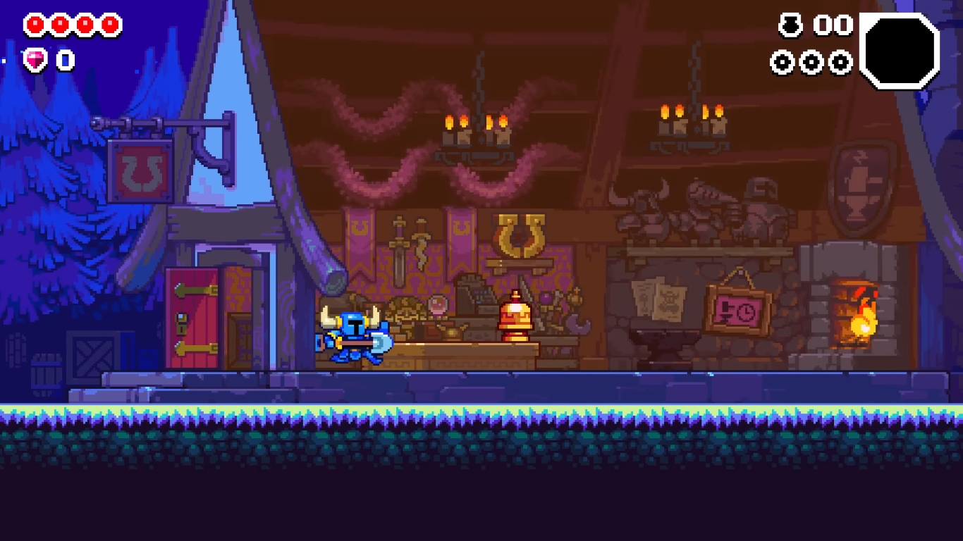 Right of the main layer, here is the shop of Hoofman, a shopkeeper who sells adventures. On the shop's roof, a Hoop Kid can be found sitting there. If Shovel Knight reach her, he befriends her and she gives him some gems as a reward. Inside the shop itself, there is a bell on the counter. By hitting it, Hoofman reveals himself from hiding behind the counter. After rescuing the Armorer from enemies in the Smeltworks, he returns here and is seen working on the forge. Both of them serve as shopkeepers: