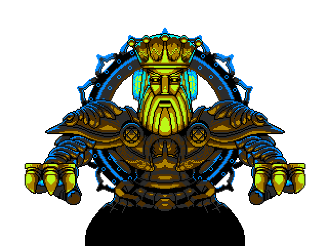 The Grand Triumvirate is a giant golden robotic-looking figure resembling a king. It wears a huge crown and has a long beard, as well as two large blue gems sticking out from either side of its head. Its hands, attached to chain-like arms, have fingers with spiked tips. Mounted on its back is a massive disk shaped like a sun with many points. Its eyes always follow King Knight in the boss room.