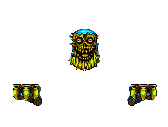 After the Grand Triumvirate's first phase is beaten, its face and body are destroyed, leaving only its hands and its badly damaged head. Its head features a much scarier skull-like face with bulging golden eyes and a grin of golden teeth. With the crown gone, a larger blue gem can be seen on top of the Grand Triumvirate's head.