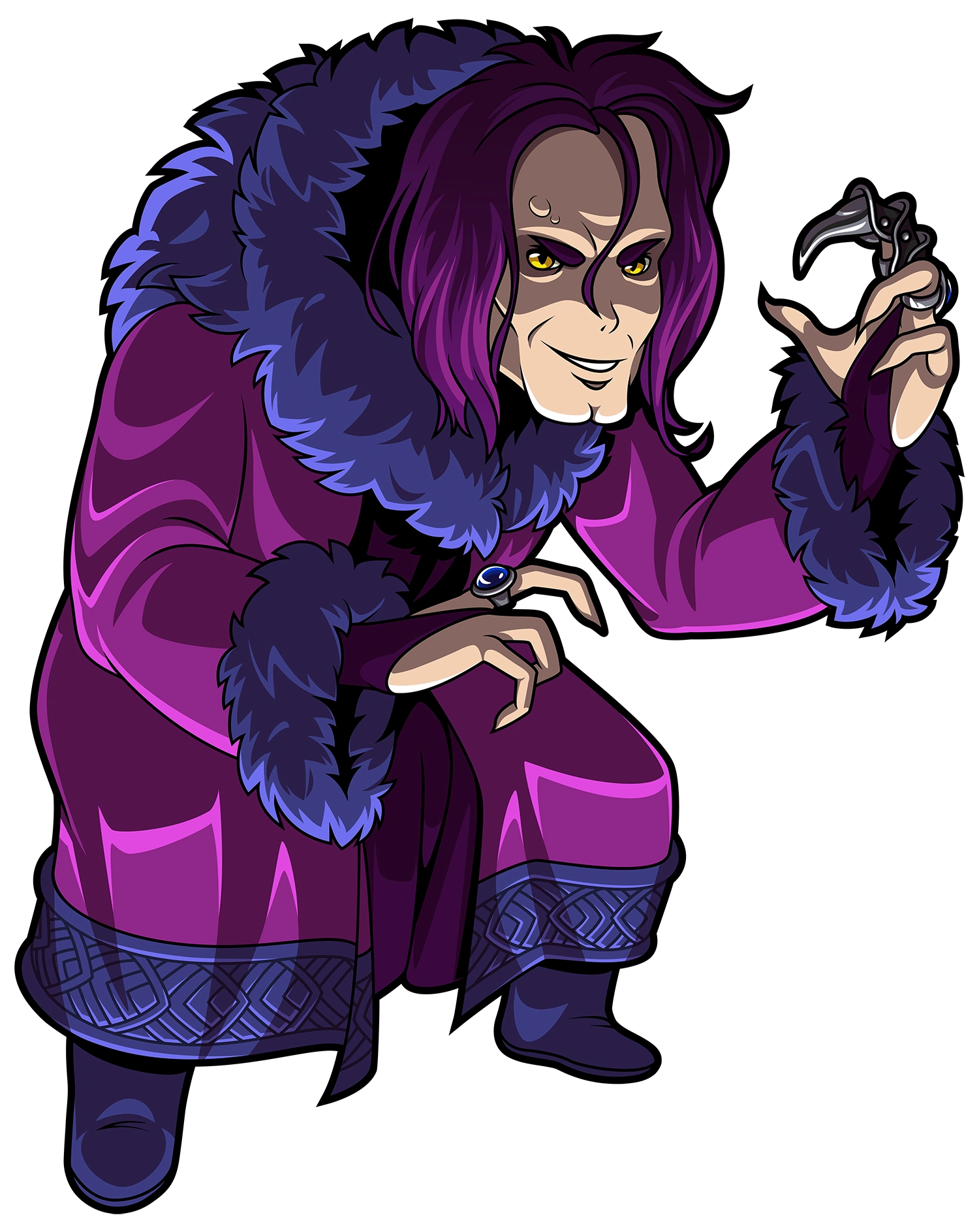 Traitorous is a purple-haired man wearing a long purple coat trimmed with dark blue fur. He hunches over when he walks, and sometimes when he talks.